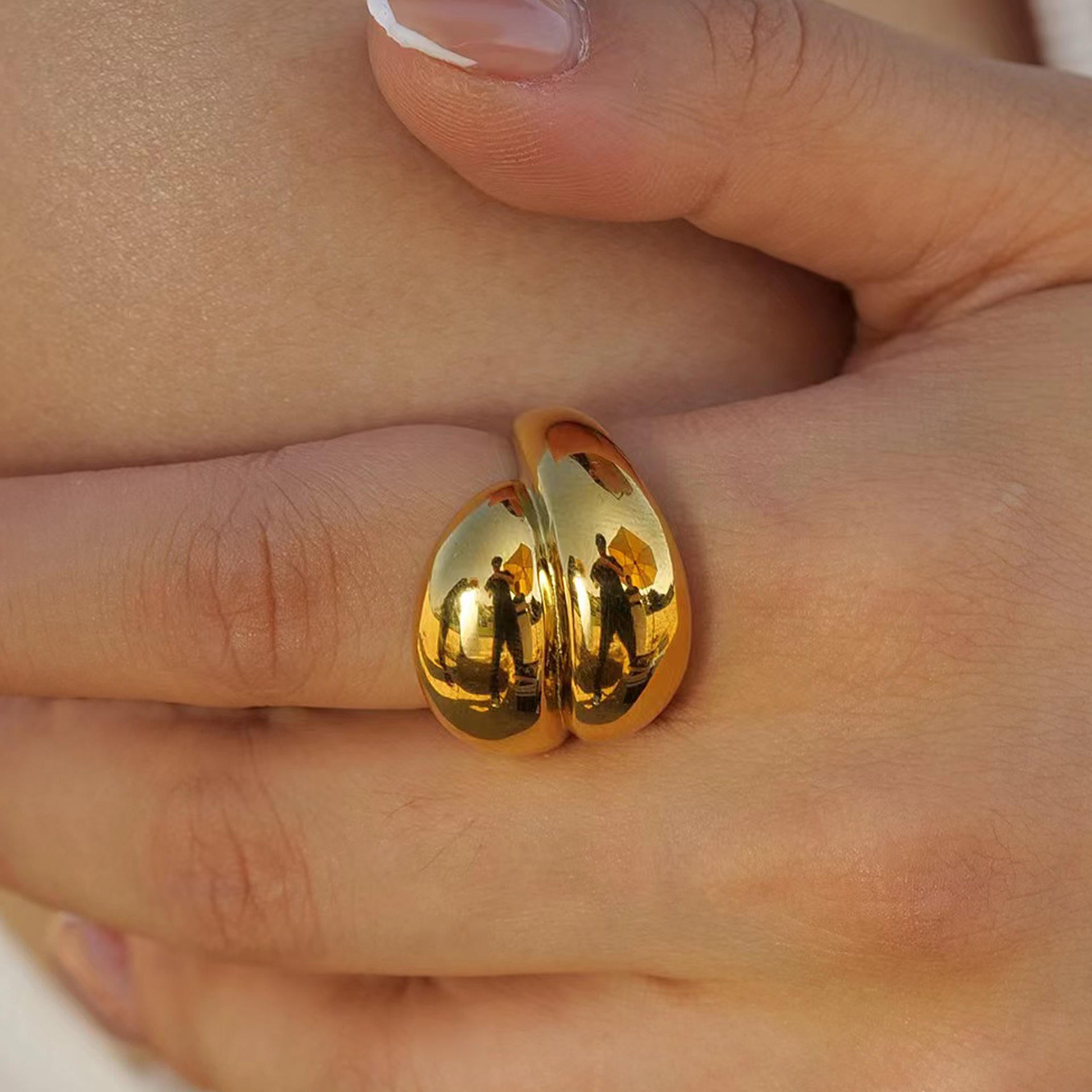 The Aurea Duo Drop Ring is a sculptural expression of modern elegance. Featuring two mirror-polished teardrop forms in high-shine gold, the design reflects light with a fluid, molten finish. Bold yet refined, its smooth contours create a statement that feels powerful without excess — a piece crafted for quiet confidence and contemporary luxury.