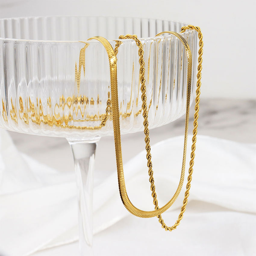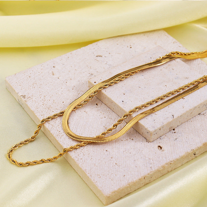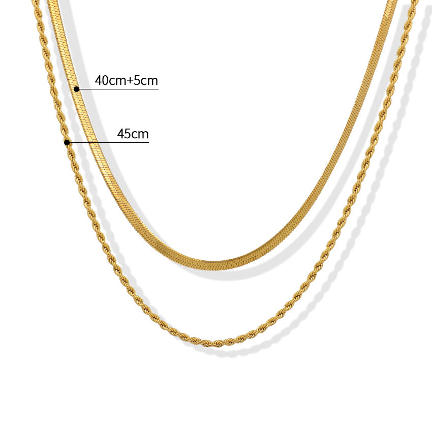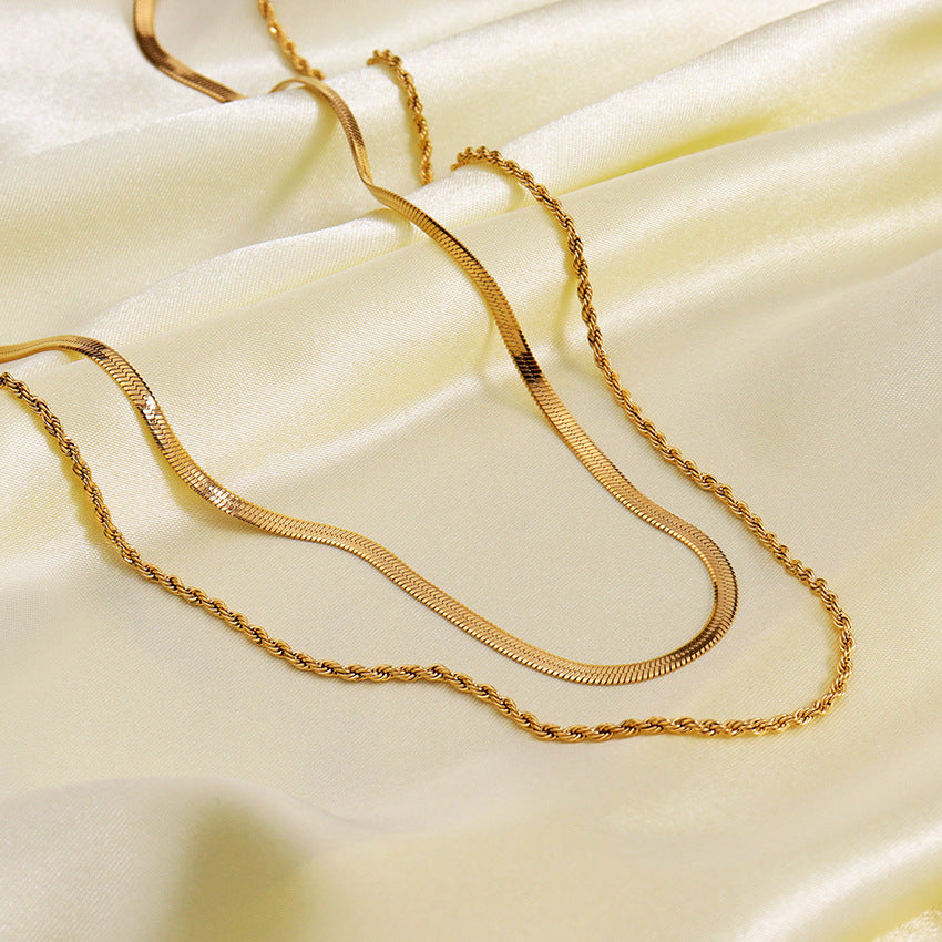 Sculpted in dual harmony — The Aurelia Necklace features a refined pairing of sleek herringbone and twisted rope chains, exuding quiet confidence and timeless sophistication. Designed in 316L stainless steel with 18k PVD gold plating, this piece blends fluid motion with enduring form. Its layered silhouette enhances every neckline, creating an effortlessly luxurious statement.