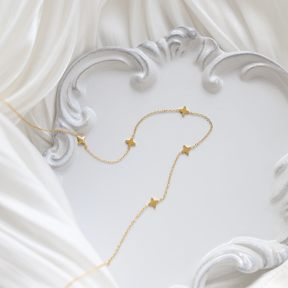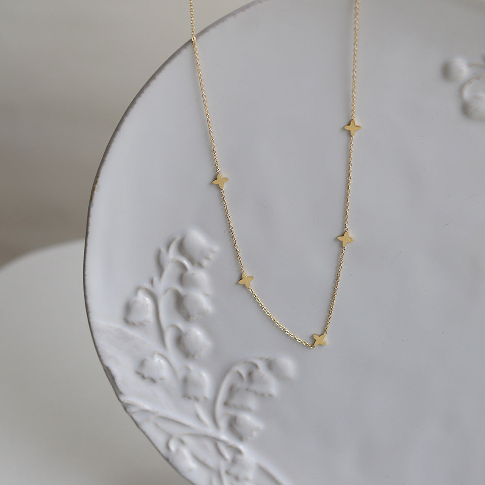Inspired by starlit serenity, The Celeste Necklace features delicate gold motifs that glimmer softly along a fine chain. Crafted from 316L stainless steel and finished with 18k PVD gold plating, this timeless design embodies lightness and quiet luxury. Minimal yet radiant, it’s designed to rest gracefully against your skin — a subtle reminder of elegance in simplicity.