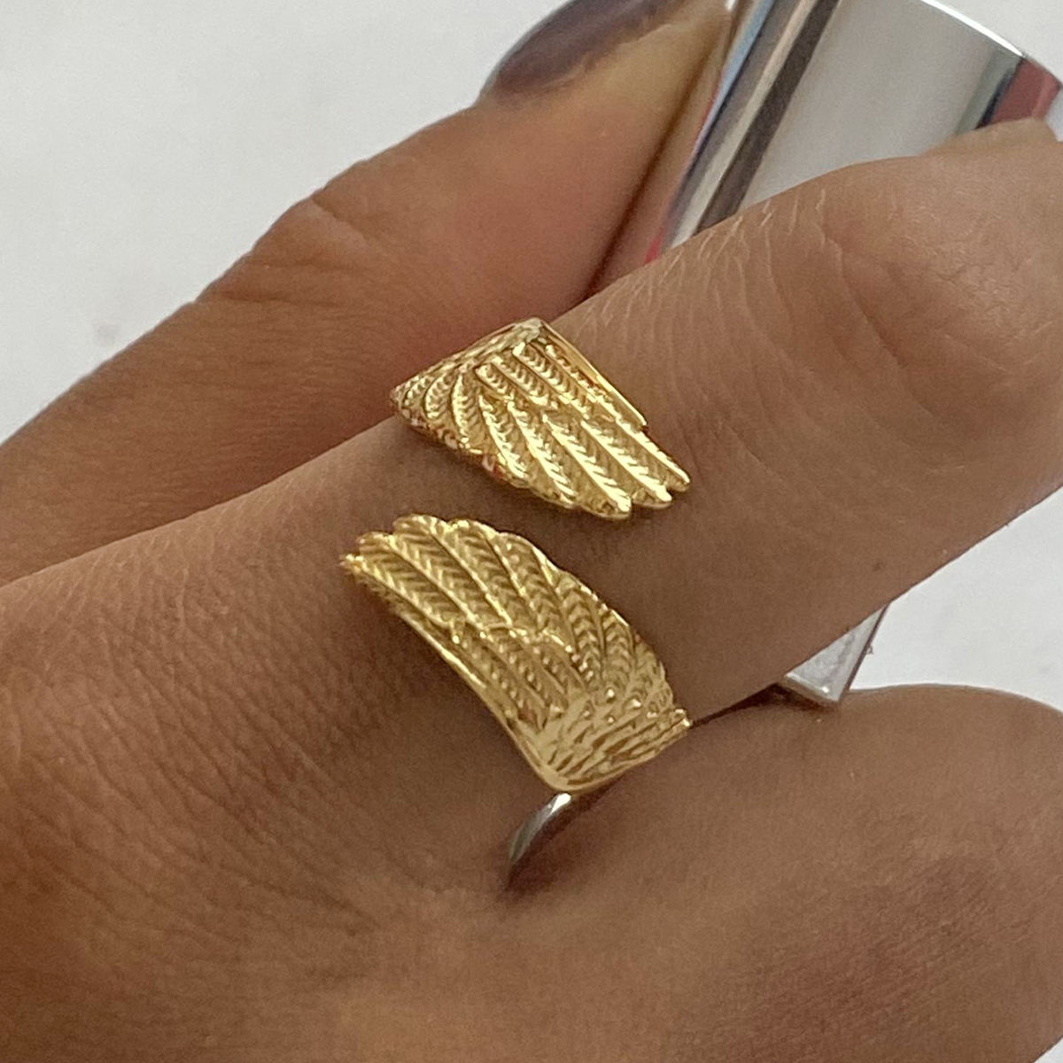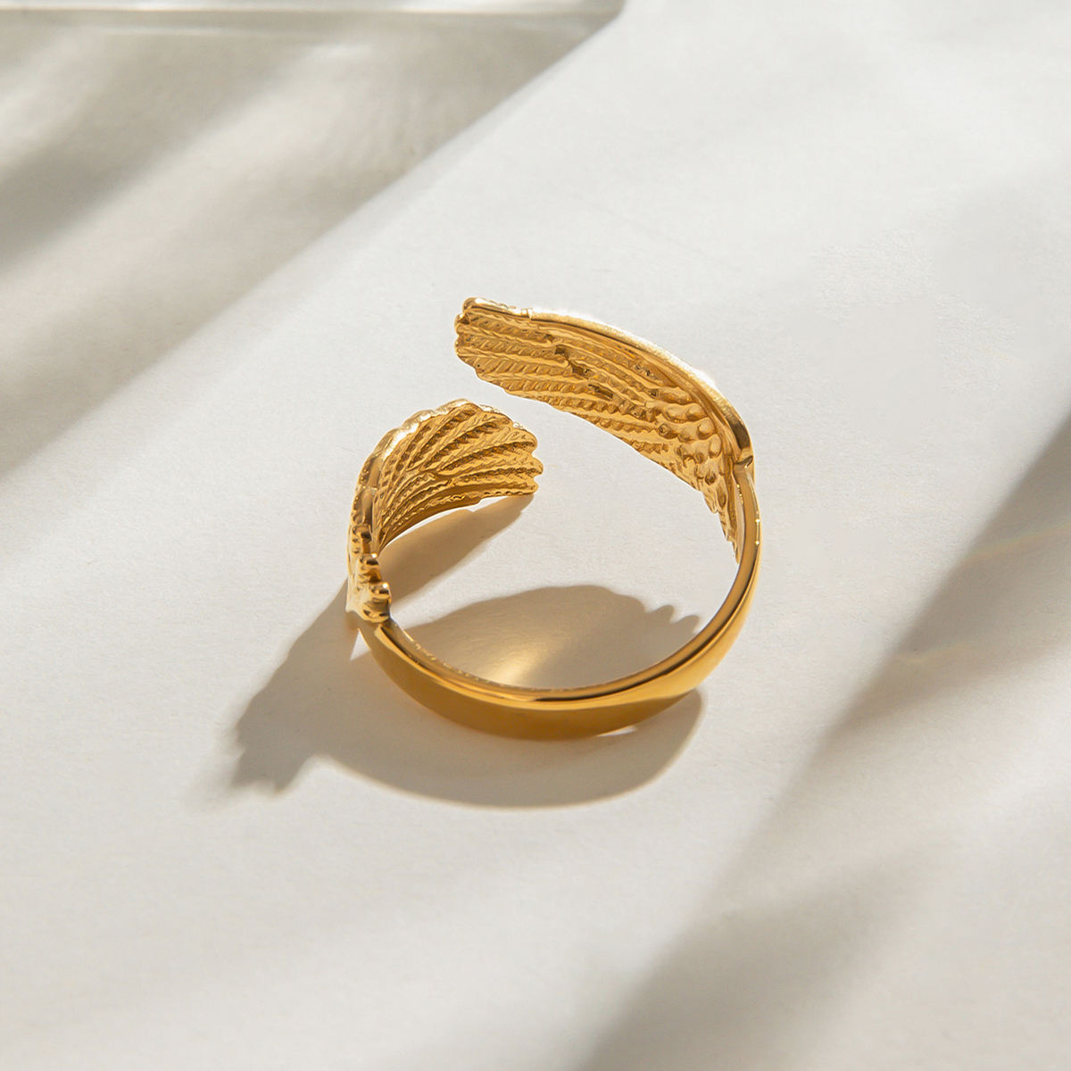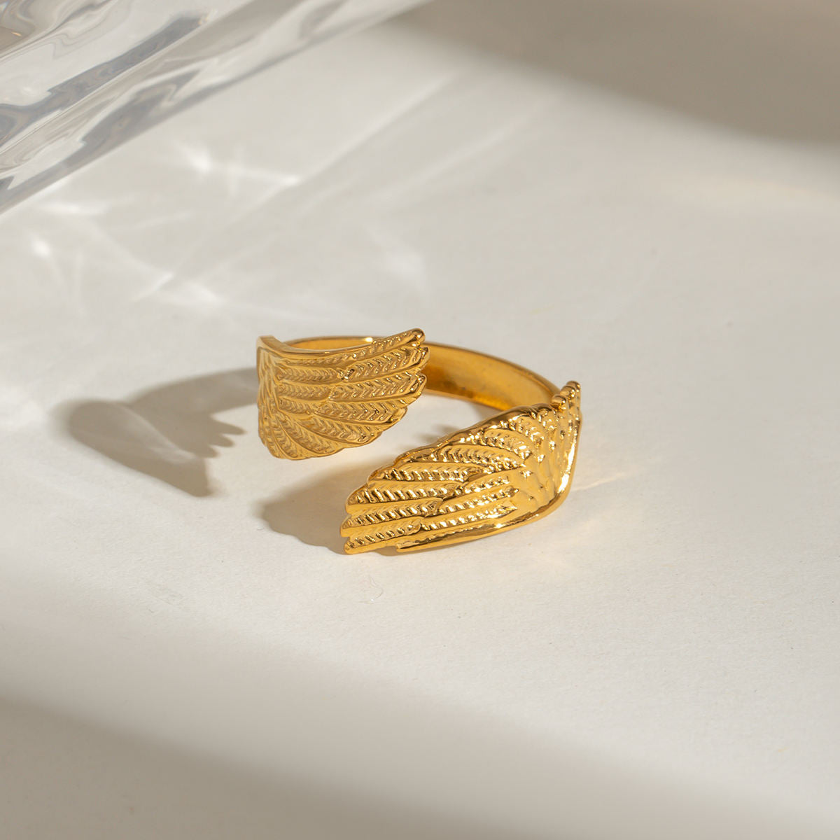 The Celestia Wing Ring captures the poetry of protection and ascension. Designed in luminous 18k gold-plated stainless steel, it features delicately sculpted angelic wings that gracefully wrap around the finger — symbolizing guidance, freedom, and strength. Its open adjustable silhouette adds modern fluidity to a deeply meaningful form, radiating elegance that feels both ethereal and powerful.