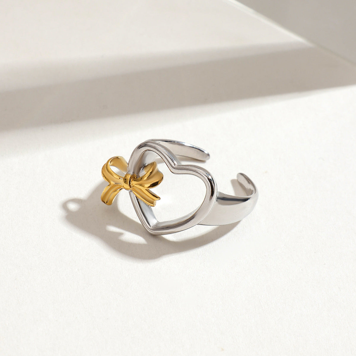 The Coeur Bow Ring redefines modern romance with its sculptural silver heart and delicate 18K gold bow detail. Crafted from premium 316L stainless steel, its dual-tone finish embodies the harmony of strength and softness. The open-heart silhouette gives it a light, airy elegance — a reminder that love is best when it feels effortless.