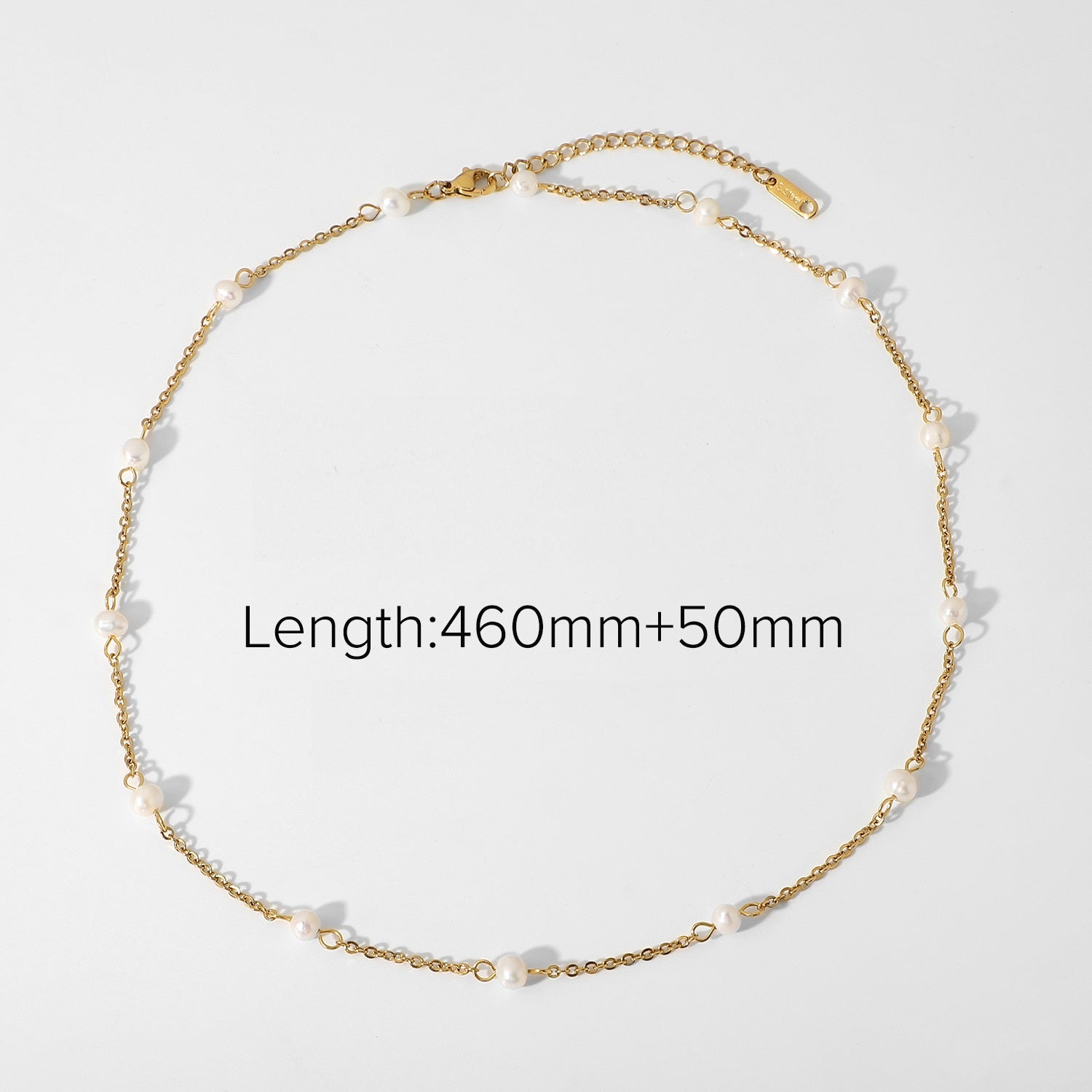 Ethereal yet enduring — The Élise Pearl Necklace embodies the understated grace of timeless femininity. Crafted from 316L stainless steel and finished in radiant 18k PVD gold, it features delicately spaced freshwater pearls along a fine chain. Each pearl glows with quiet sophistication, celebrating natural beauty through modern minimalism.