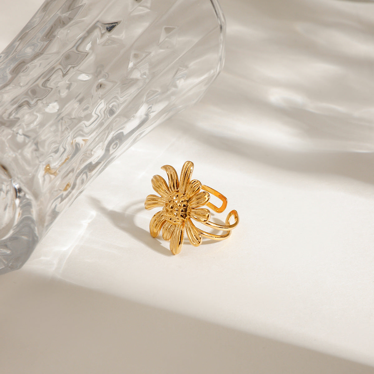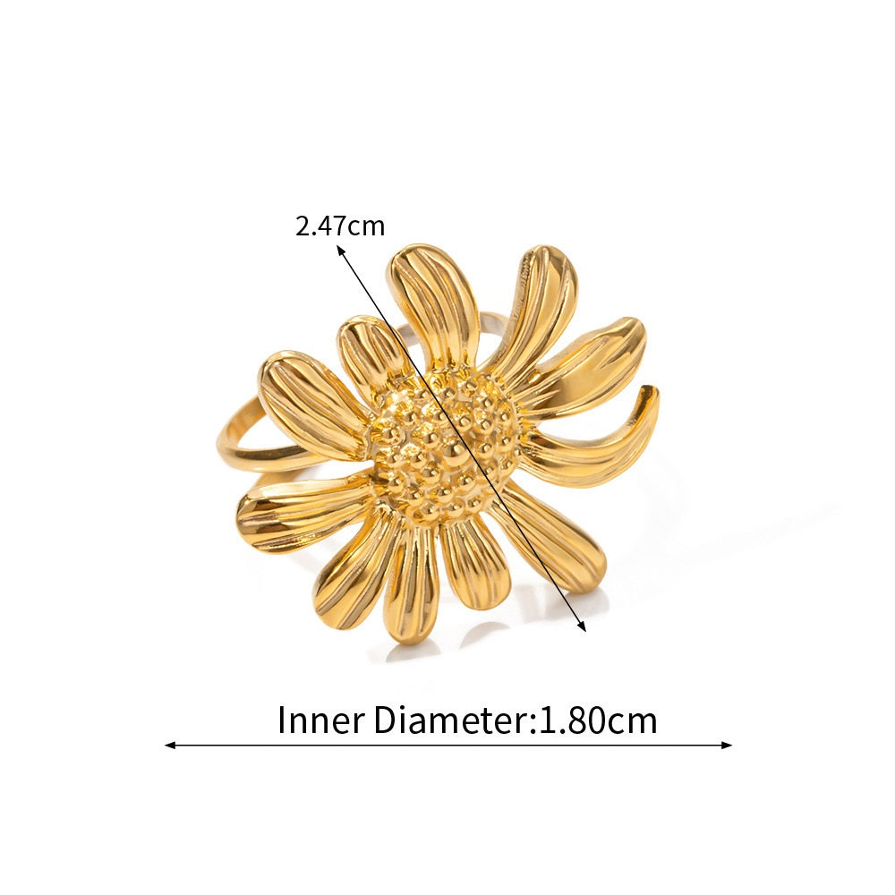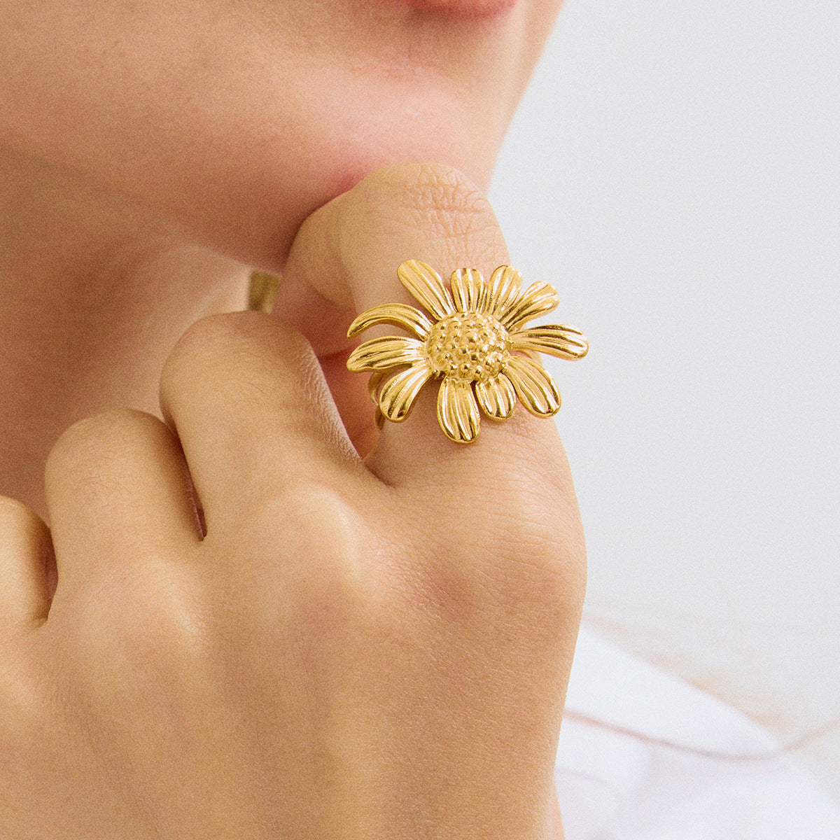 The Fleur Soleil Ring is a golden ode to the spirit of sunlight and strength. Crafted from 316L stainless steel with 18K PVD gold plating, its detailed petals and radiant texture evoke the warmth and brilliance of a blooming flower. Designed to make a statement while retaining timeless charm, it adds a touch of sculptural grace to any ensemble.