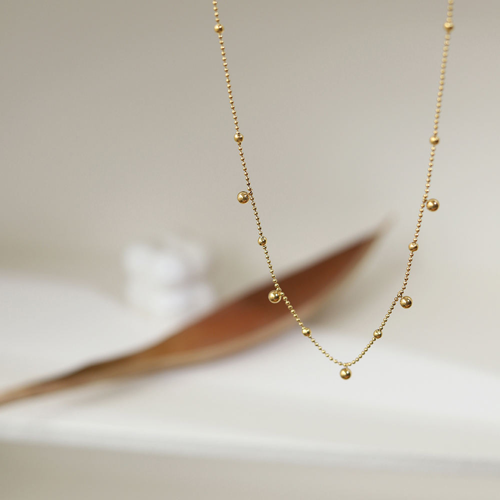 A whisper of gold that glows against the skin — The Lumière Necklace captures the art of understated radiance. Each delicate bead, crafted in 316L stainless steel with 18k PVD gold plating, reflects soft light with every movement, creating a quiet shimmer reminiscent of morning sunlight. Refined, minimal, and endlessly versatile, it’s designed to elevate both everyday wear and evening elegance.