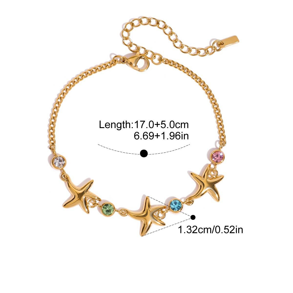 Inspired by the serene rhythm of the sea, the Maris Gem Bracelet captures oceanic grace in 18K gold-plated stainless steel. Each star-shaped charm is interspersed with radiant multicolor crystals — representing the hues of sunrise over water. Light yet luxurious, this bracelet embodies effortless joy and timeless charm.