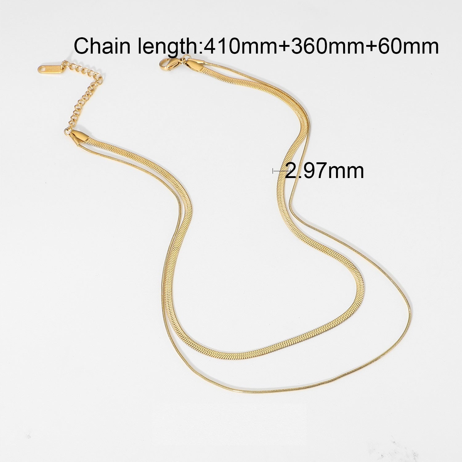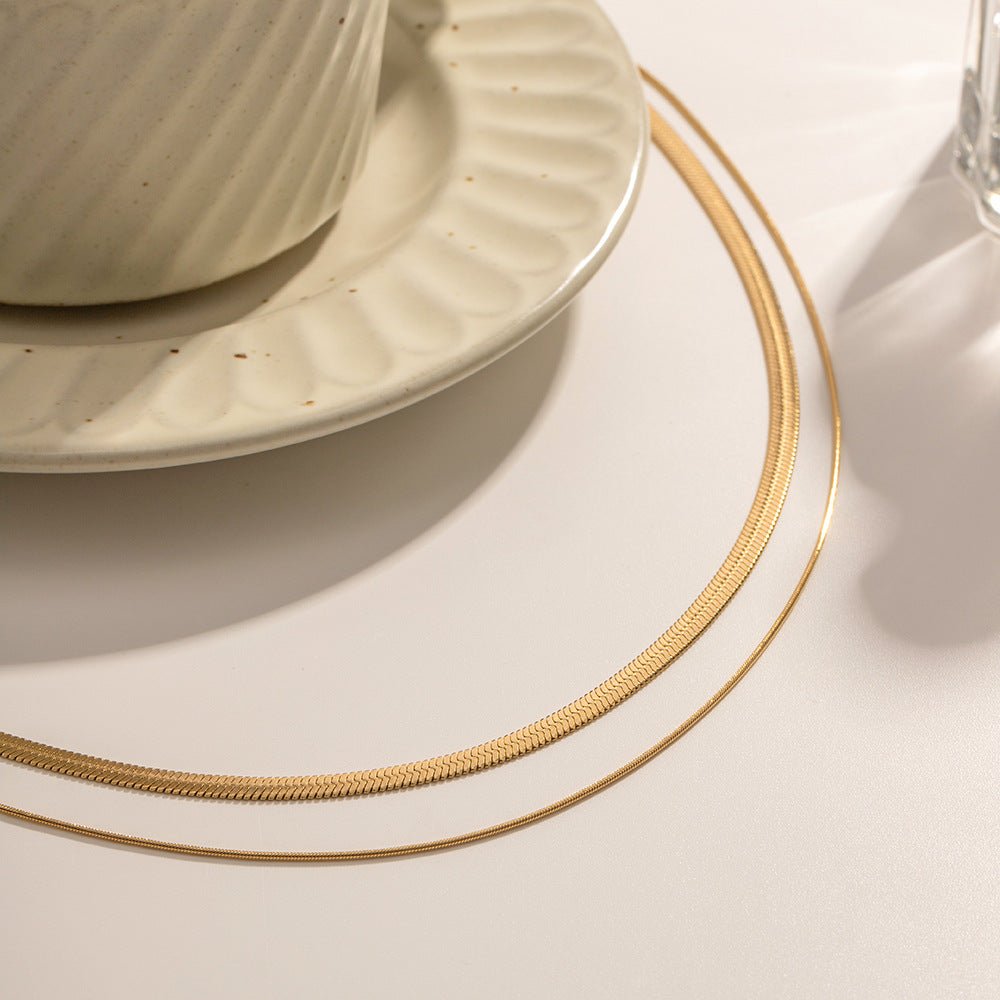 Sophistication meets simplicity in The Milan Layered Chain. Designed with a dual-layer silhouette featuring sleek snake and slim rope chains, this piece captures modern elegance with a timeless edge. Finished in premium 18k PVD gold plating, it reflects a soft, fluid shine that enhances every neckline.