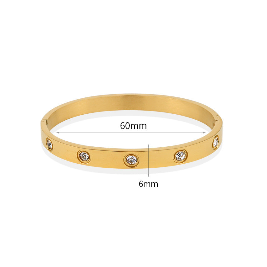 The Radiant Circle Bangle embodies timeless charm with a modern twist. Crafted from 316L stainless steel and coated in luxurious 18k PVD gold, it features evenly spaced cubic zirconia stones that catch the light with every move. Its sleek circular design symbolizes eternity and confidence — perfect for those who shine effortlessly.